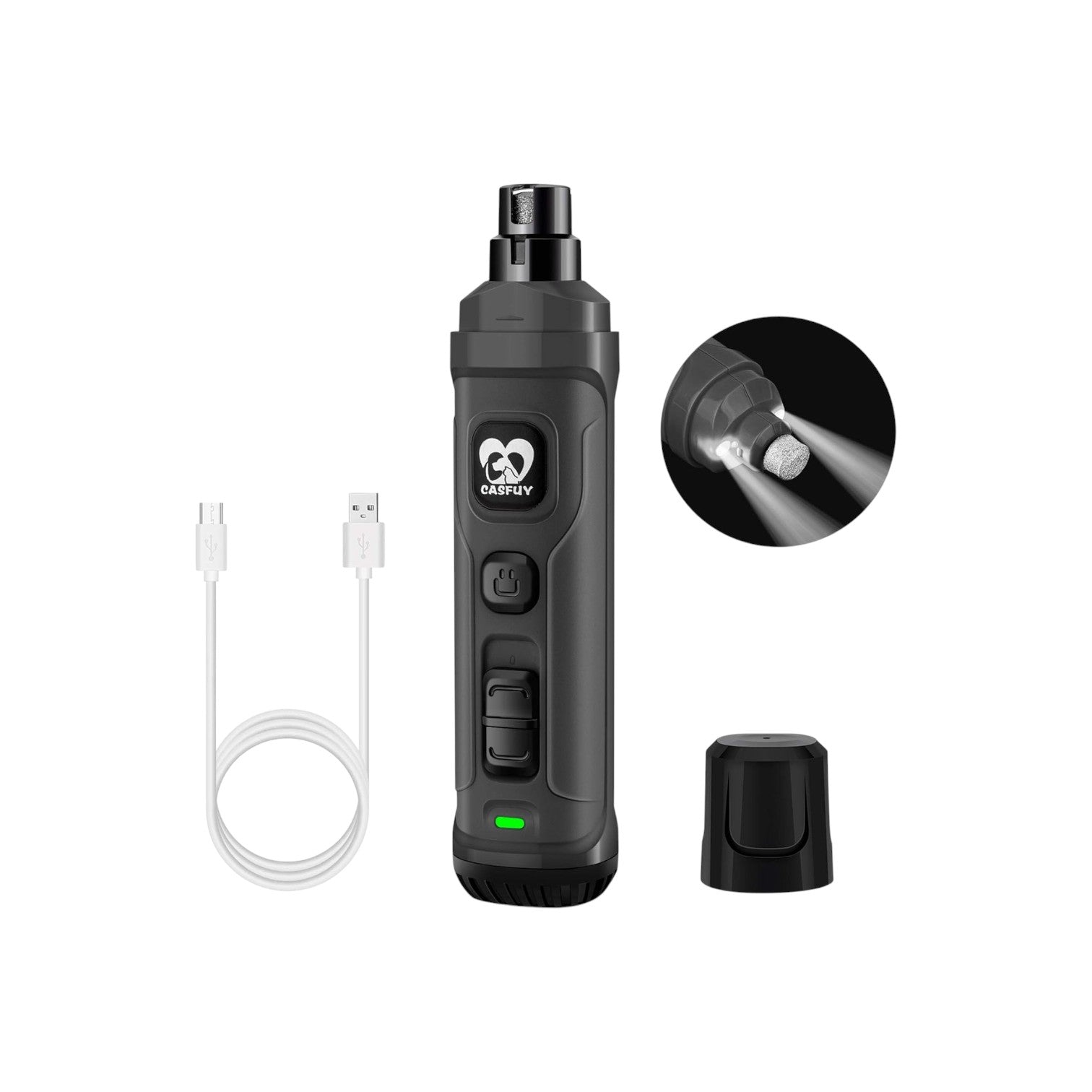 - Recortadora de uñas para perro mejorada con 2 luces LED: el recortador de uñas eléctrico para perro Casfuy tiene 2 luces LED que te permiten ver la ubicación del perro rápidamente más fácilmente. Evita moler excesivamente, causando menos daño a tus amigos peludos. Las luces LED duales son un nuevo diseño, las luces brillan con mayor precisión que otras amoladoras LED ordinarias.