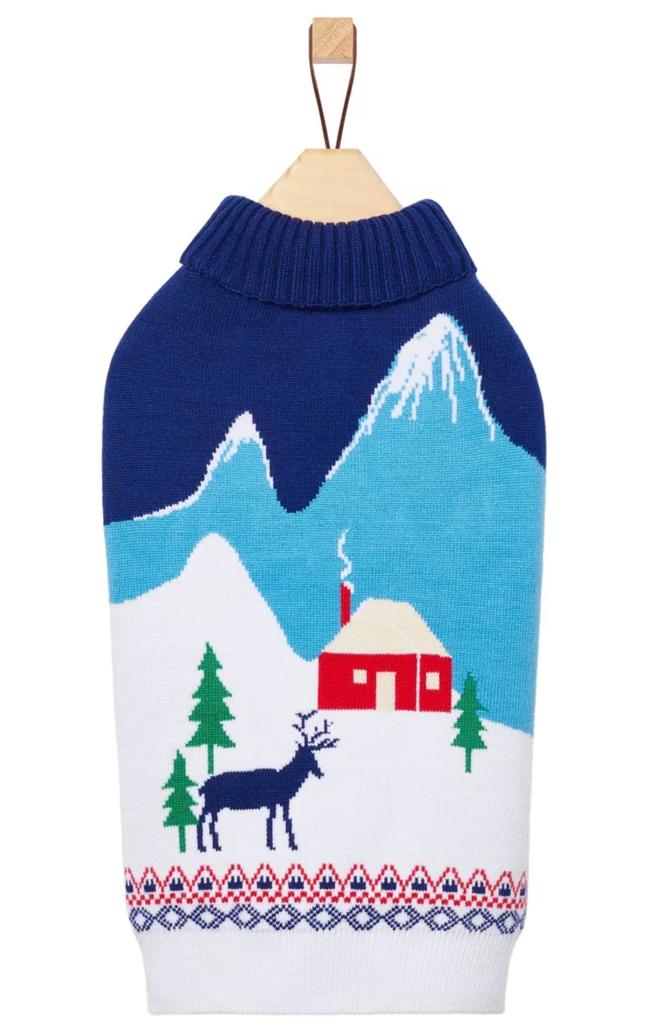 Este acogedor suéter para mascotas presenta un cuello alto y un patrón de punto intarsia que representa una cabaña en una ladera nevada. La textura gruesa y acanalada del cuello y las mangas proporciona un ajuste cómodo y cálido que no limita la libertad de movimiento de tu mascota. El dobladillo es de punto acanalado con elástico integrado para evitar que se arrugue con el uso repetido.