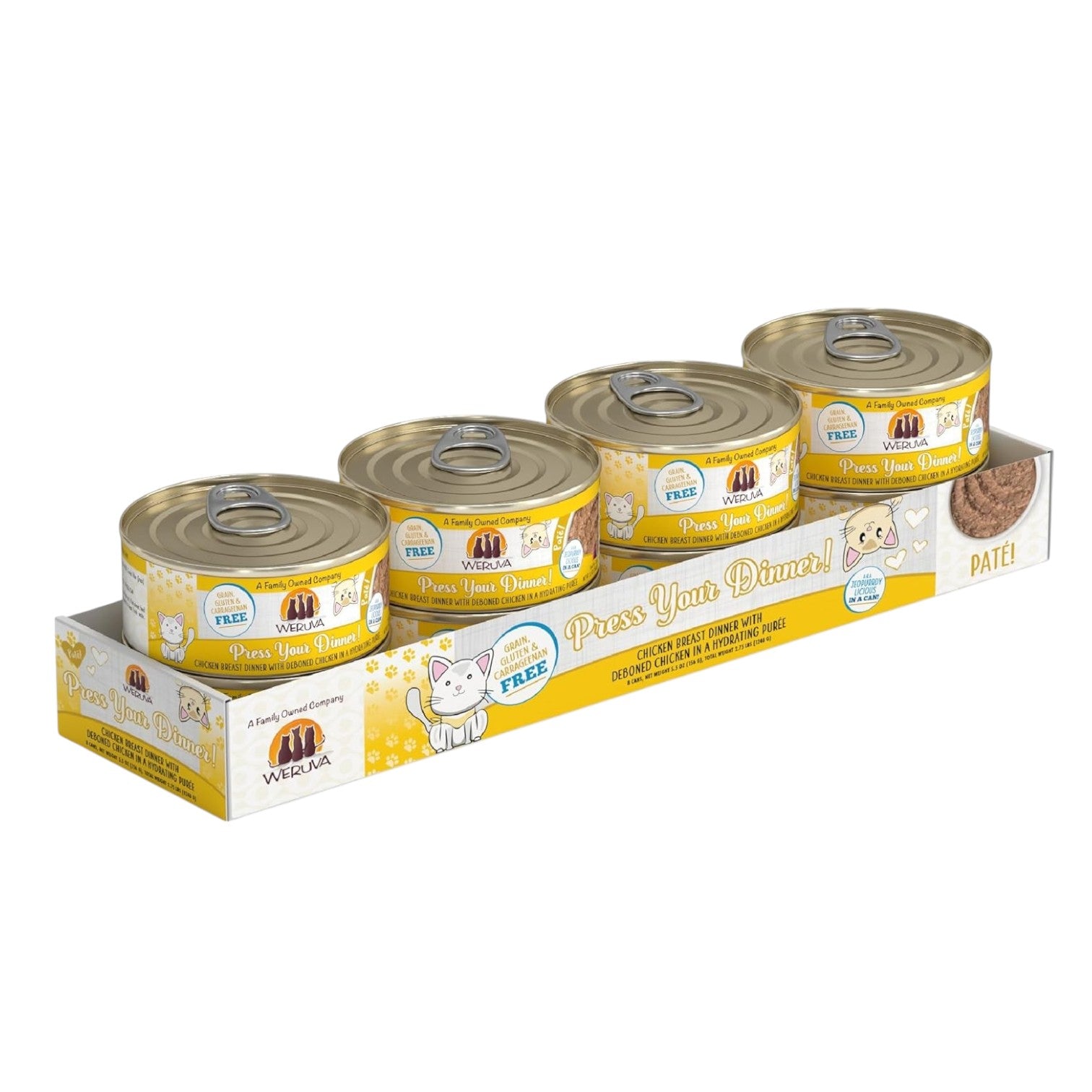 - Press Your Dinner. (latas de 5.5 onzas, paquete de 8) Pollo de carne claro y oscuro sin jaulas, sin hueso, sin piel, hecho puré en un cremoso paté.