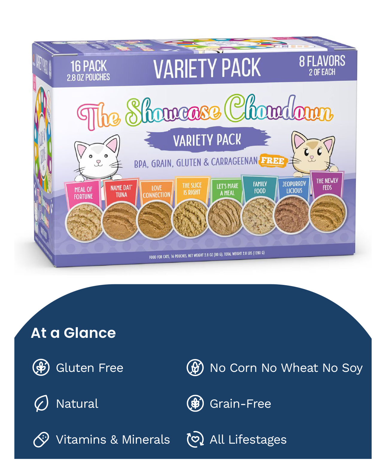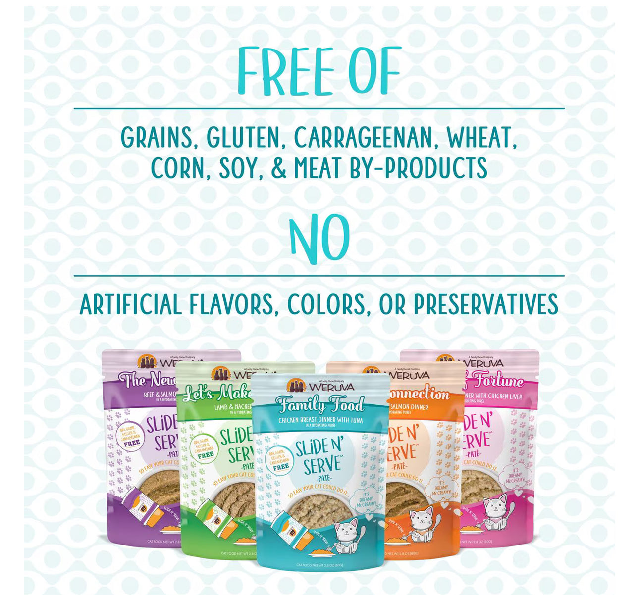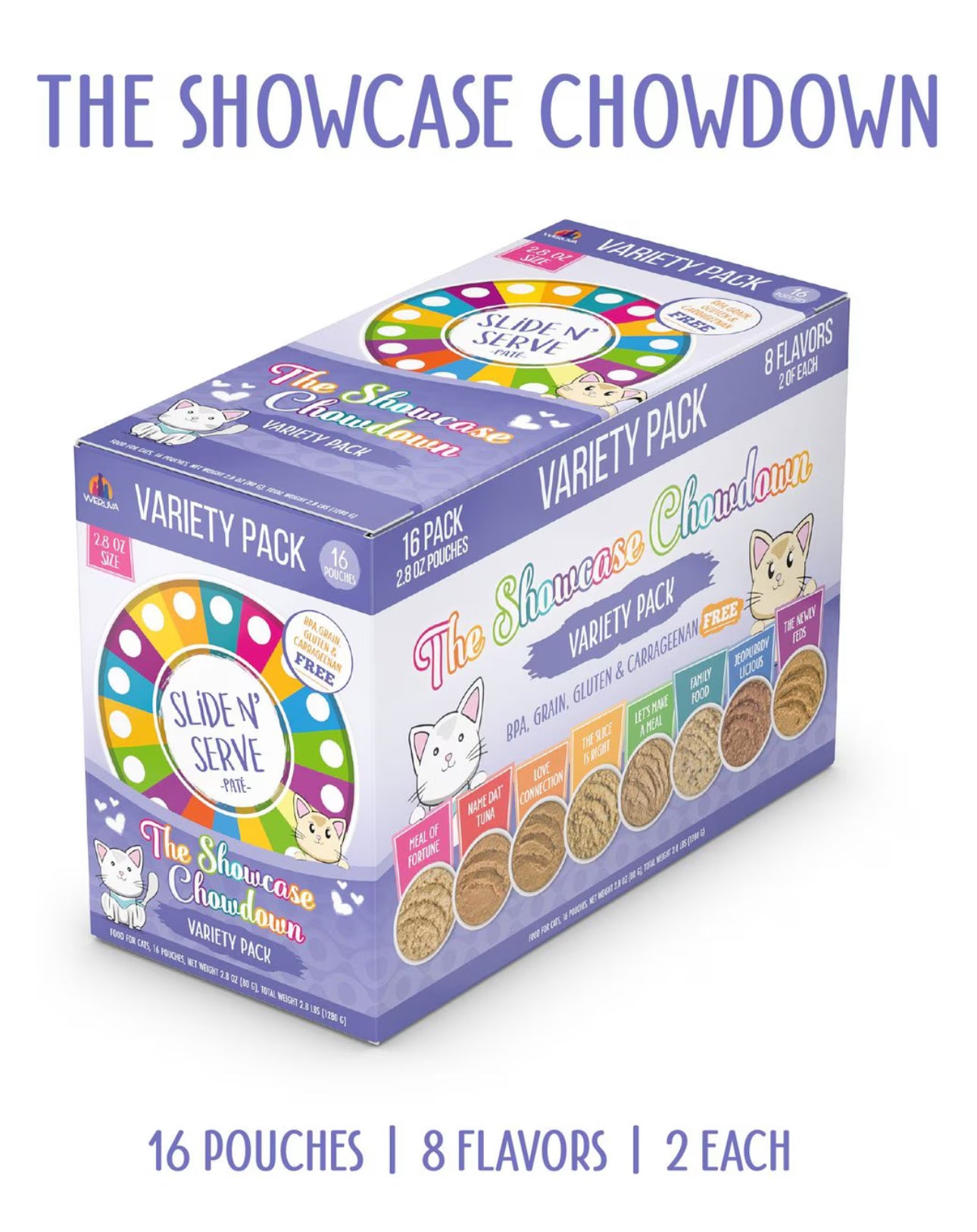 Weruva Slide N' Serve Paté, alimento húmedo para gatos, The Showcase Chowdown Slide N' Serve, bolsa de 2.8 oz (80 g), paquete variado de 16