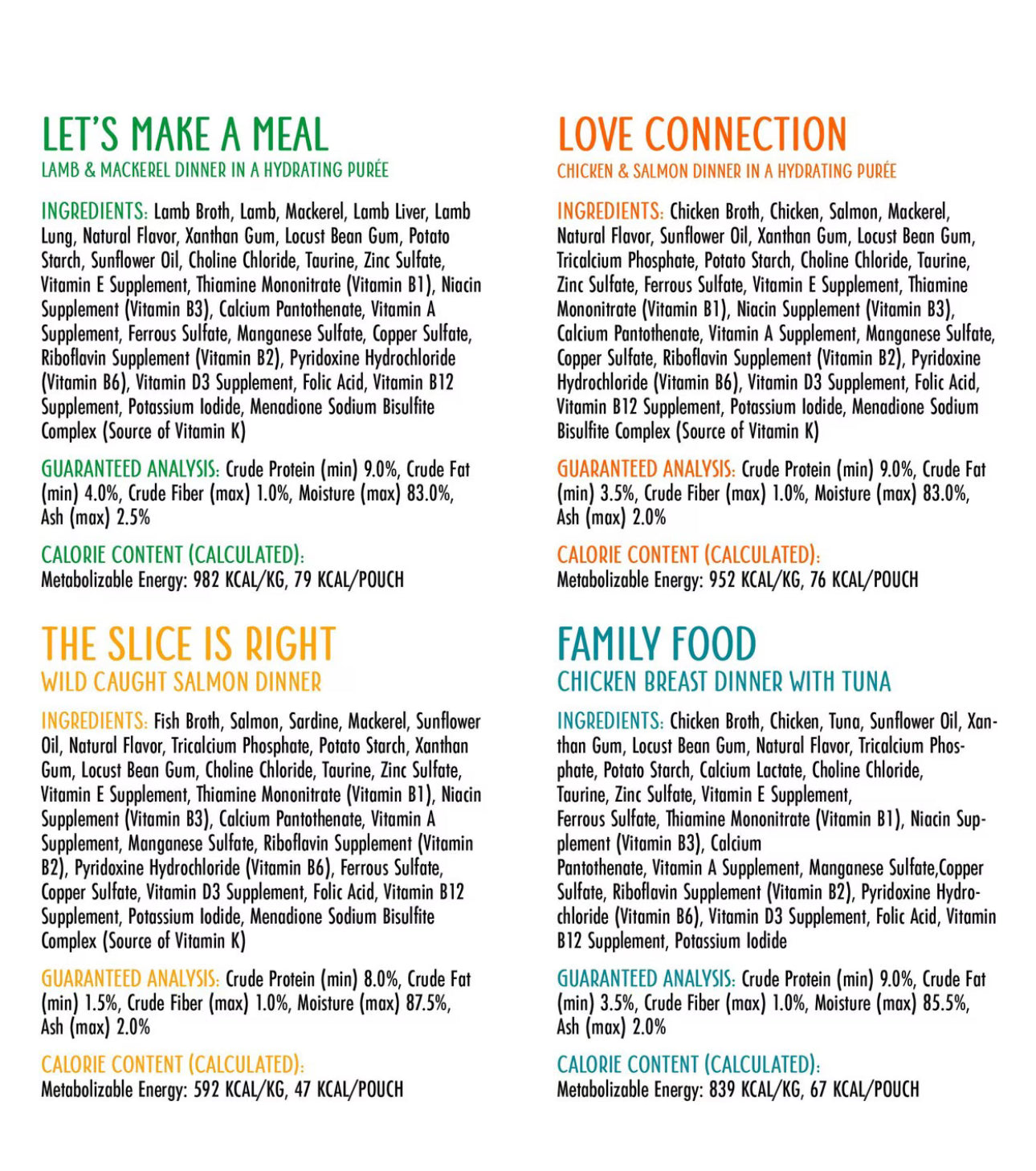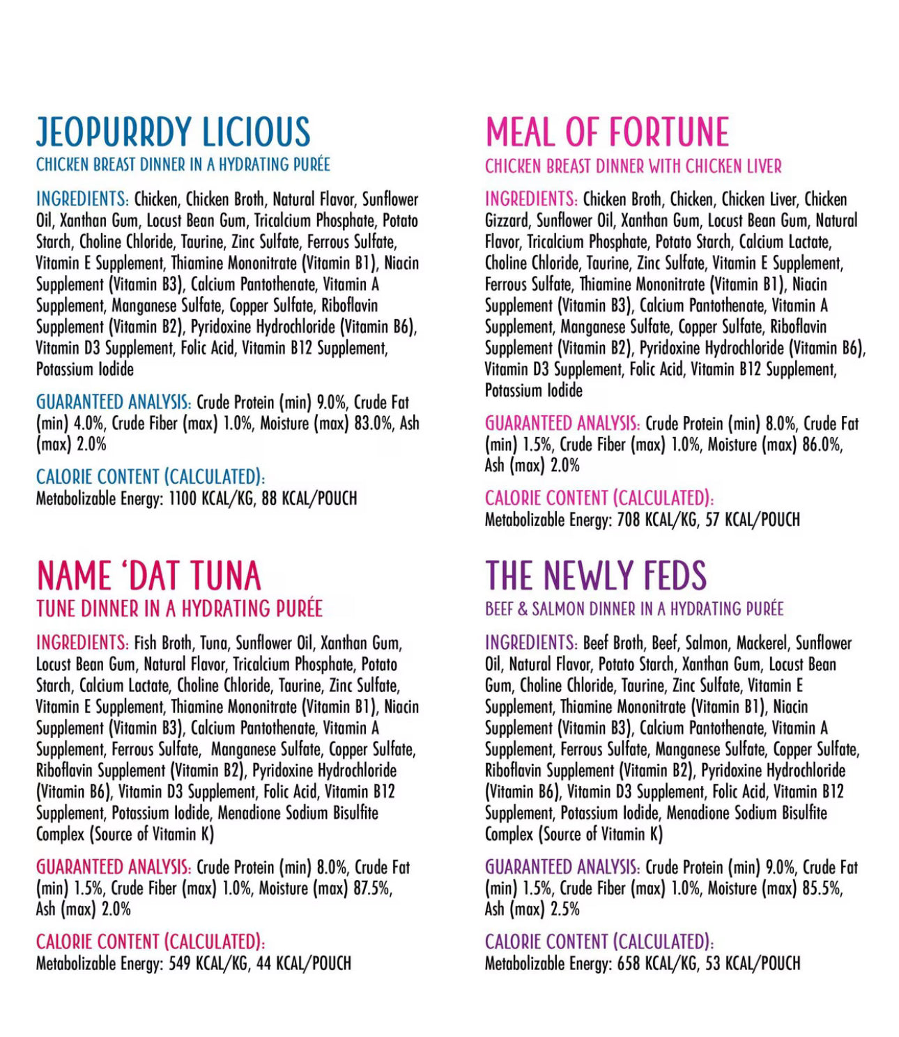 - El paquete variado incluye 2 bolsas de cada sabor: The Newly Feds, Jeopurrdy Licious, Love Connection, Let’s Make a Meal, Meal of Fortune, Name 'Dat Tuna, The Slice is Right y Family Food.